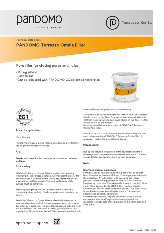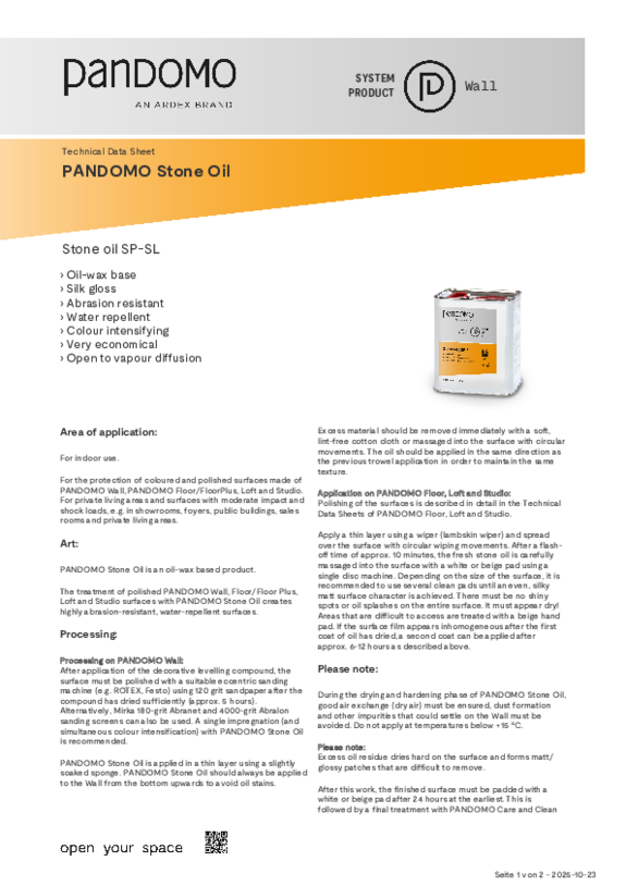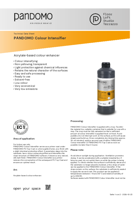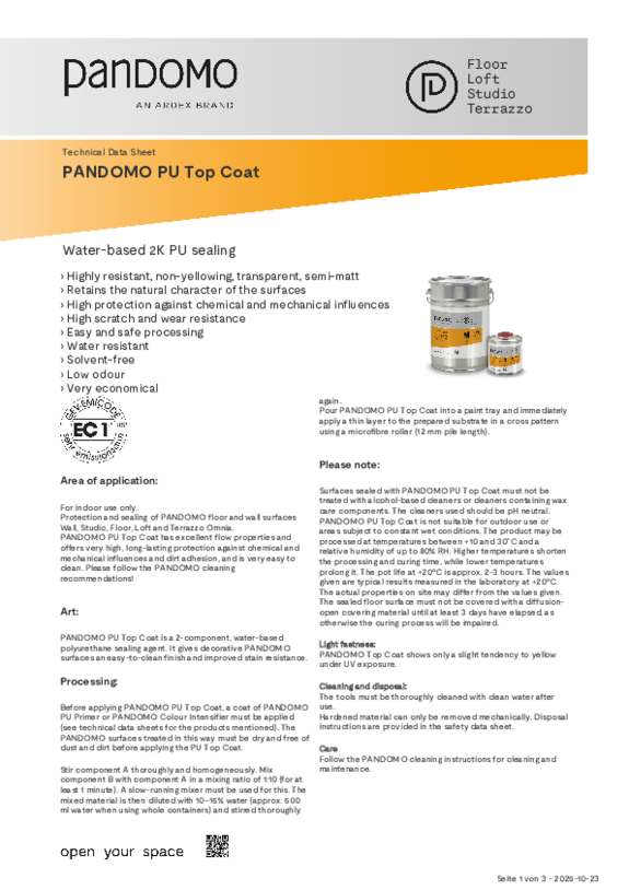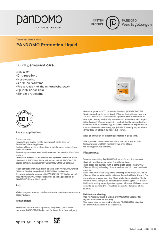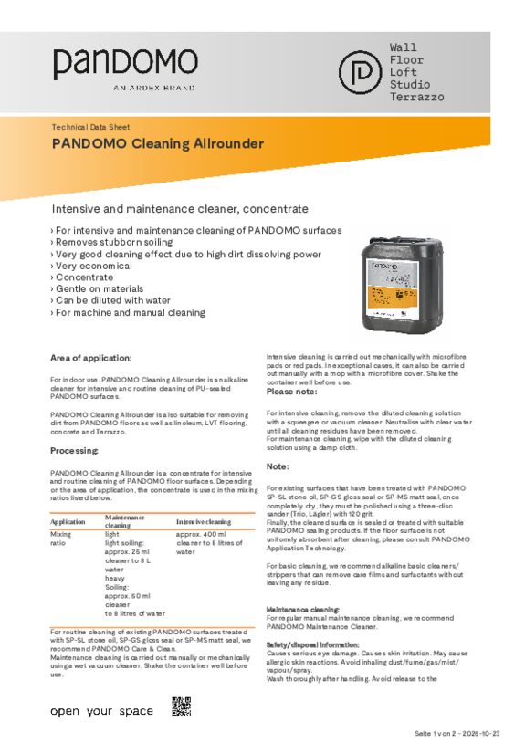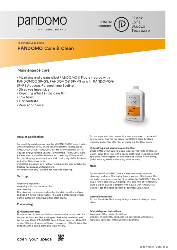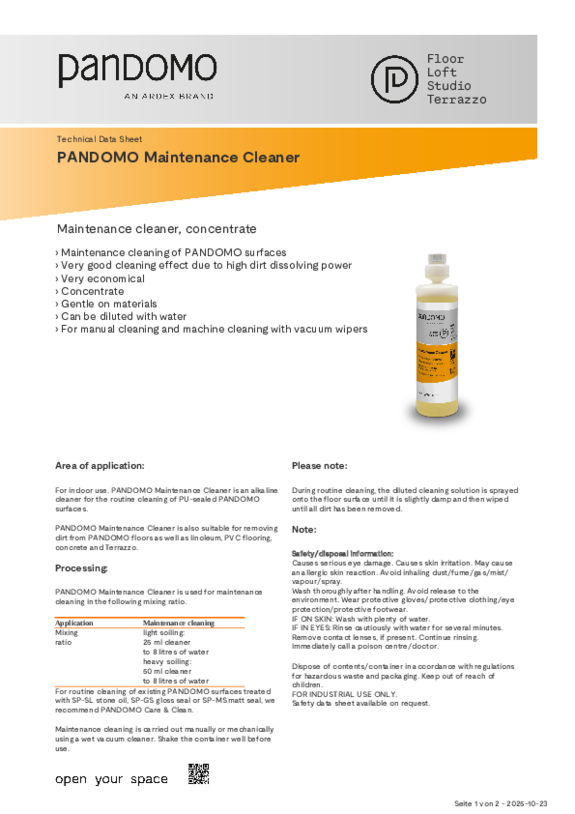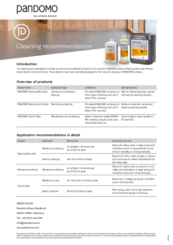 PANDOMO surfaces are very resistant and easy to clean. Cleaning with neutral detergents is possible at any time. Standing liquids should be absorbed immediately. PANDOMO also offers its own cleaning products. For detailed information, download our cleaning brochure.