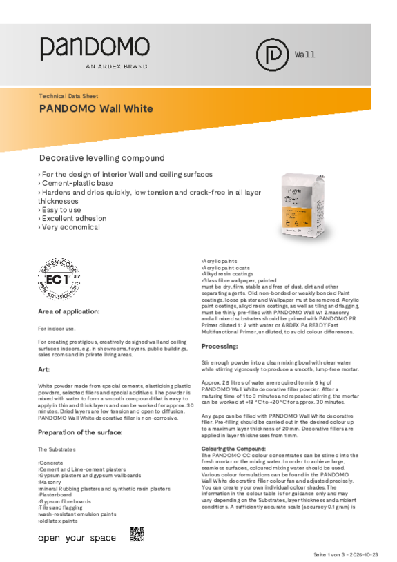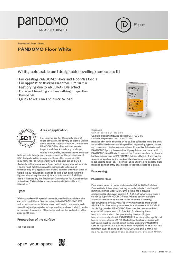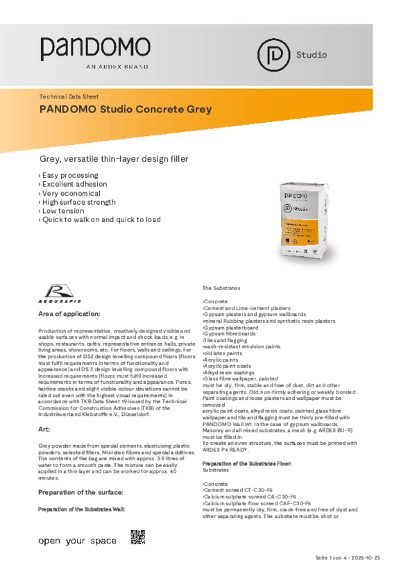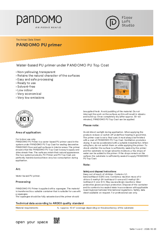 PANDOMO can be used on solid, crack-free surfaces. In the case of floor products, screeds from ARDEX are particularly suitable as a substrate, or hollow floors, e.g. from Lindner. However, application over existing tiles is also possible. Plasterboard walls, wedi panels, worktops, three-dimensional objects, furniture or doors can also be given a customised surface with PANDOMO levelling compounds. If you are unsure whether PANDOMO is suitable for your project, simply contact your local PANDOMO partner company.